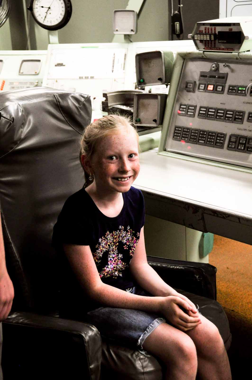 The docent told us all about the mission room, the cool rules who had to be there and why, and what all the many buttons and lights indicated. How the place is built is SO neat. I loved learning all about that! After he explained all the buttons and lights and procedures, Clara got to help "launch" the missile. It's a two man job...